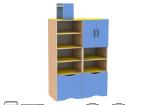 В двух цветовых сочетаниях: стойки бук-натур, фасады светло-синие, полки желтые ИЛИ стойки бук-натур, фасады манго, полки салатовые