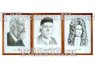Представляют собой комплект портретов формата А3, выполненных на качественной белой бумаге, в деревянной раме под стеклом. На портретах указаны фамилии (с именами, либо с именами и отчествами) и даты жизни ученых. При подготовке портретов использованы наиболее известные изображения ученых.